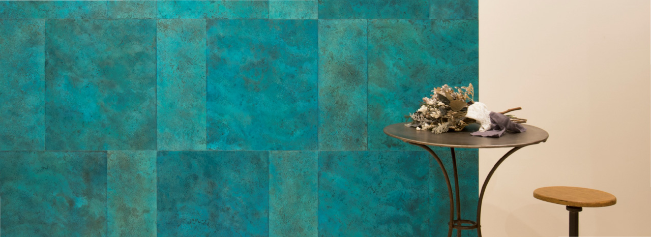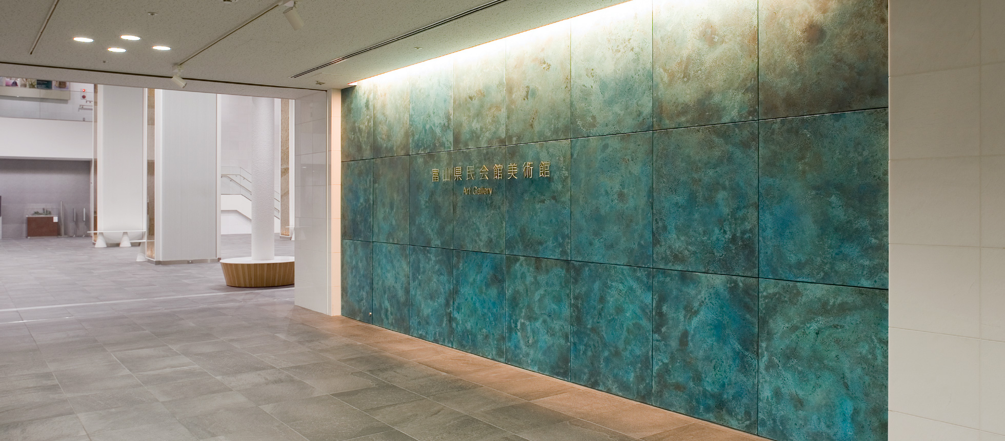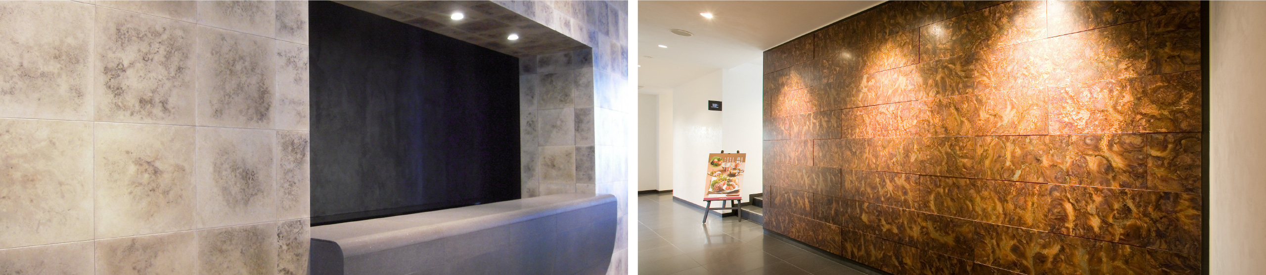 美術館、レストラン、ビルのエントランス、ホテルの暖炉など、銅・真鍮の発色技術を応用した壁面装飾。